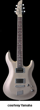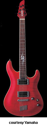 RGZ-121P | - offset double cutaway RGX-style alder body, bolt-on maple neck, 22-fret bubinga fingerboard with pearl dot inlays, maple headstock overlay with large Yamaha logo, six-on-one-side tuners, Vintage II vibrato bridge, black pickguard, two humbucker (neck, bridge) and one single coil (mid) pickups, two knobs (v, tone), five-way pickup switch, chrome hardware, available in Black, Lightning Blue, or Vivid Red finish, 25.5 in. scale, mfg. 1991-93. |