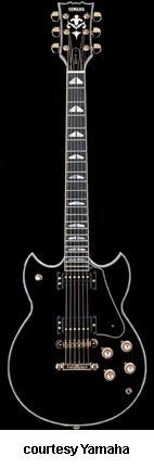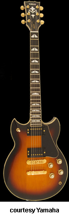 SBG 1000 (FIRST VERSION) | - symmetrical double sharp cutaway mahogany body, carved maple top, cream body binding, set mahogany neck, 22-fret bound rosewood fingerboard with split pearl triangle inlays, bound black headstock overlay with Yamaha logo and design inlay, three-per-side tuners, solid brass bridge, stop tailpiece, black pickguard, two covered humbucker pickups, four black speed knobs (two v, two tone), three-way pickup switch, coil tap in the tone knob, jack on face of guitar, gold hardware, available in Black or Cherry Sunburst finish, 24.75 in. scale, mfg. 1983-84. |