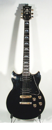 SBG 1200 | - symmetrical double sharp cutaway mahogany body, carved maple top, cream body binding, set mahogany neck, 22-fret bound rosewood fingerboard with split pearl triangle inlays, bound black headstock overlay with Yamaha logo and design inlay, three-per-side tuners, solid brass bridge, stop tailpiece, black pickguard, two covered humbucker pickups, four black speed knobs (two v, two tone), three-way pickup switch, coil tap in the tone knob, jack on face of guitar, gold hardware, available in Antique Stain or Black finish, 24.75 in. scale, mfg. 1984-85. |
